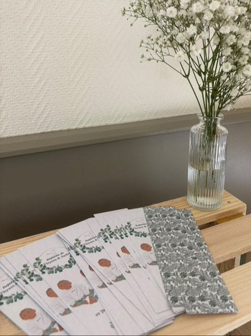 Personnalisez cette journée unique avec des signets illustrés de votre bout de chou, des pancartes de bienvenue charmantes à l’entrée de la salle, ou encore de jolies cartes de vœux. Vos invités pourront y écrire un mot doux et un souhait pour l’avenir de l’enfant.